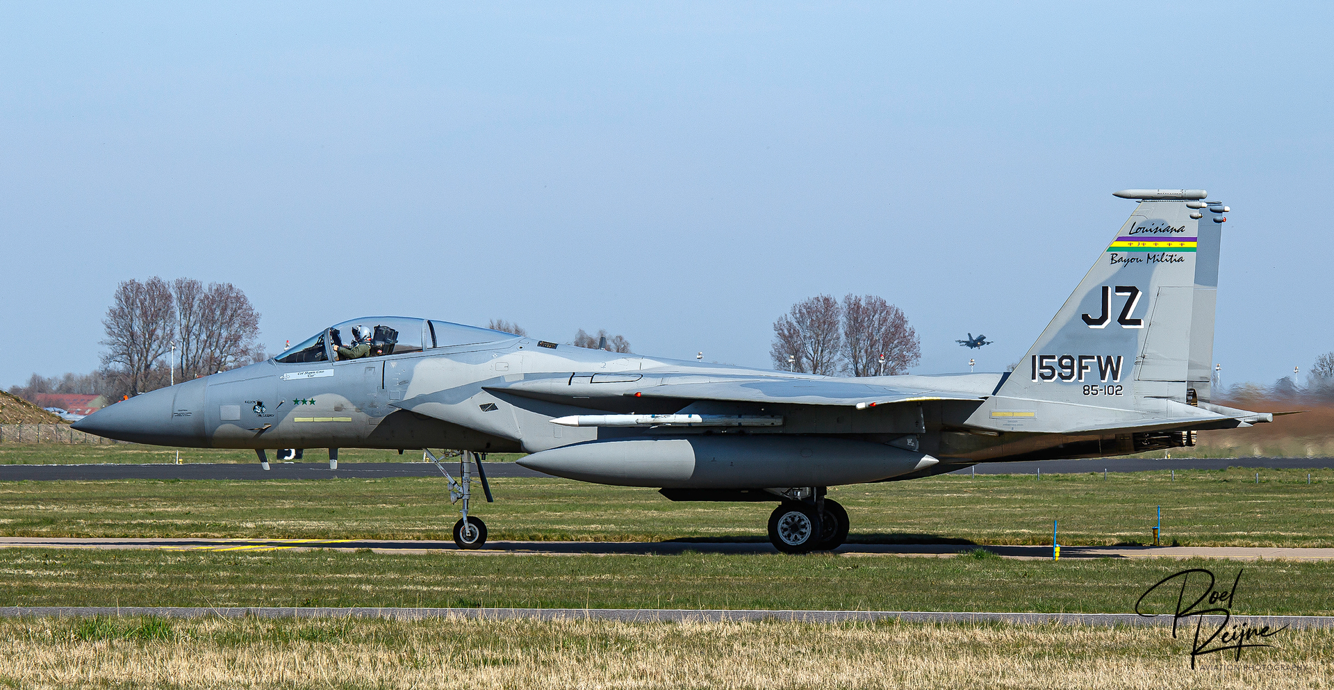 LA ANG F-15B arriving at Sioux City Iowa, bringing a pilot to fly a freshly painted Eagle back to New Orleans, the Iowa ANG base had a paint facility for various ANG fighters. This was August 2001.